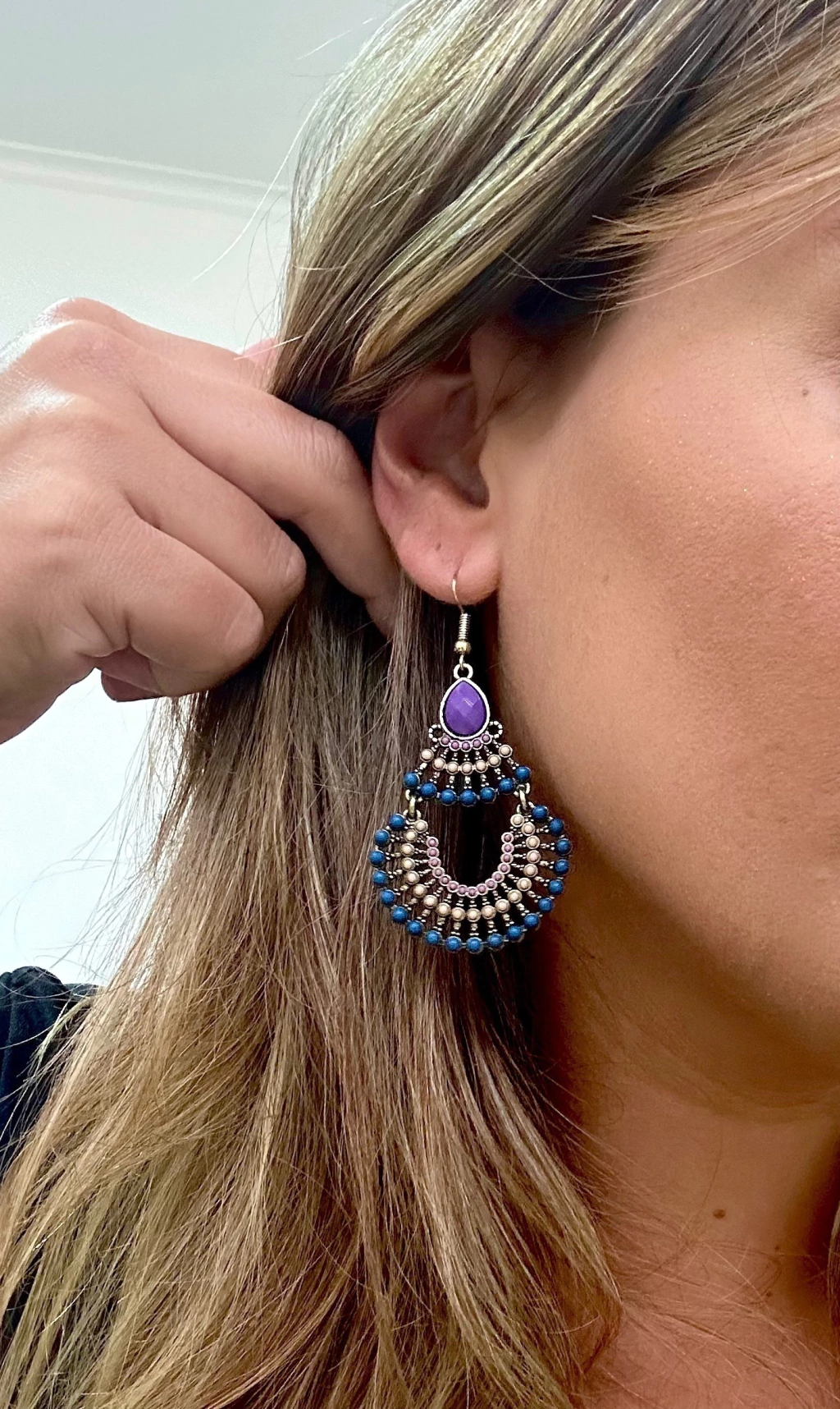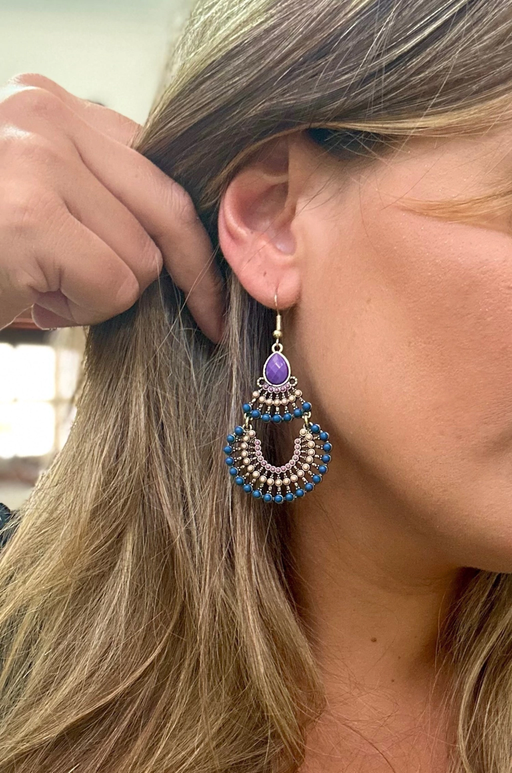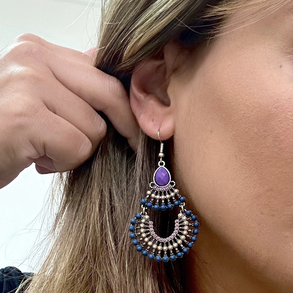 - Cor: Metais em ouro velho. Pedra facetada roxa e contas de resina em tons de roxo e rosa