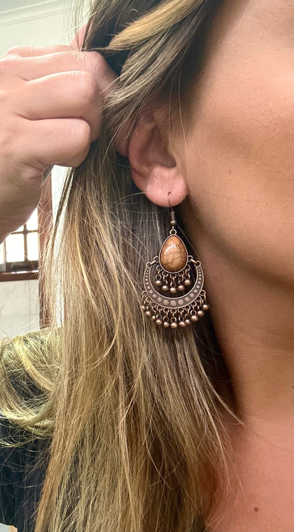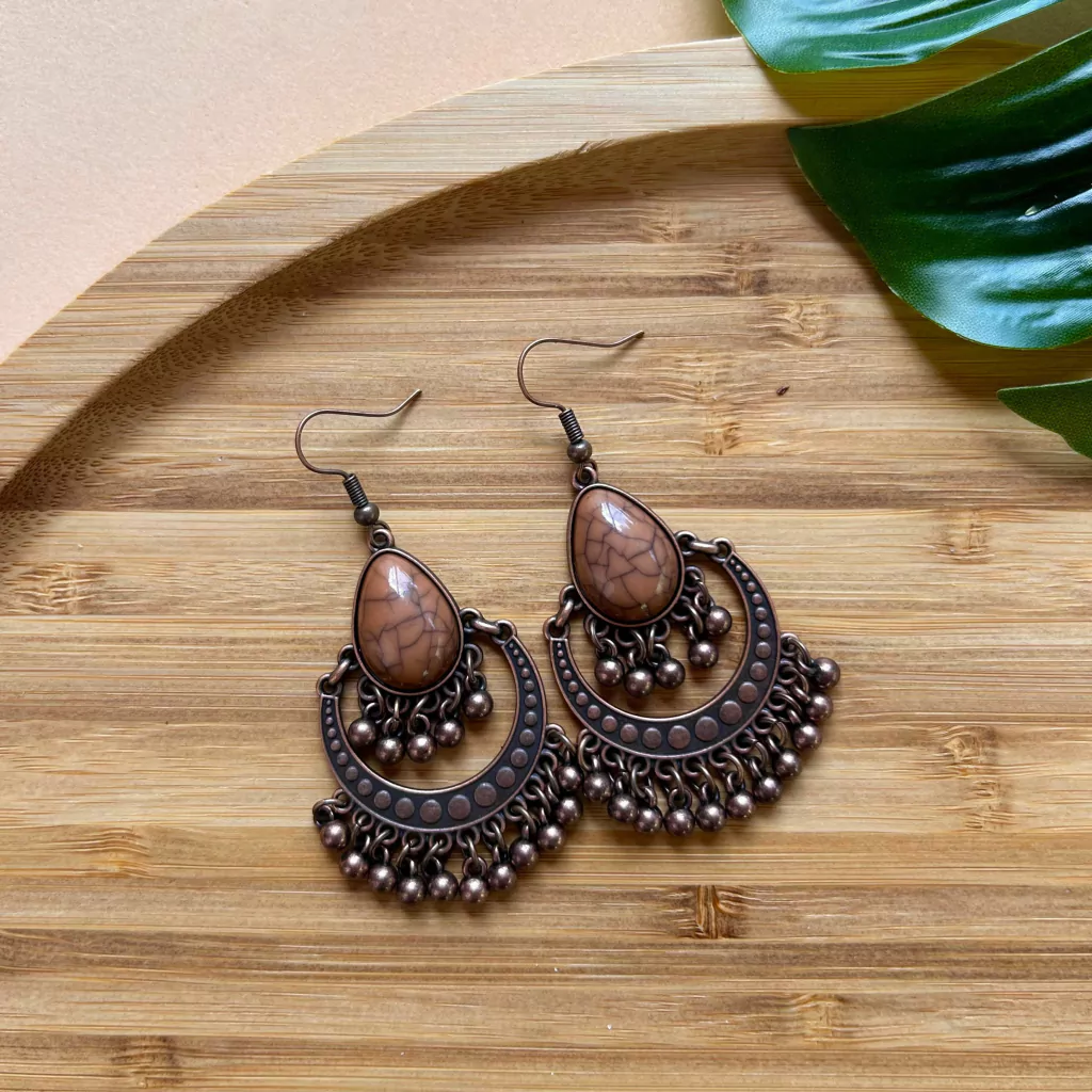 - Cor: Metais banhados em bronze. Pedra na cor marrom
