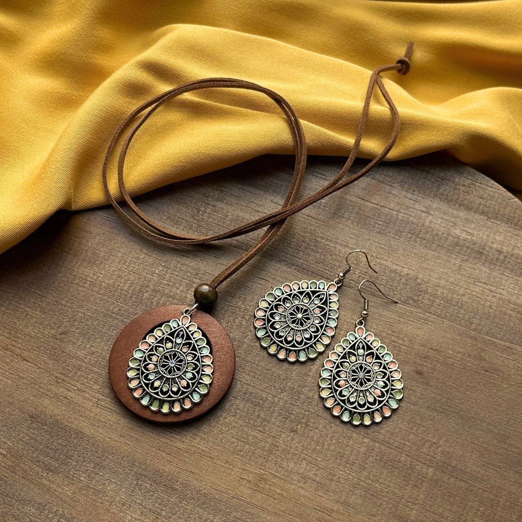 - Cor: Camurça, entremeio, pingente e conta de madeira marrom