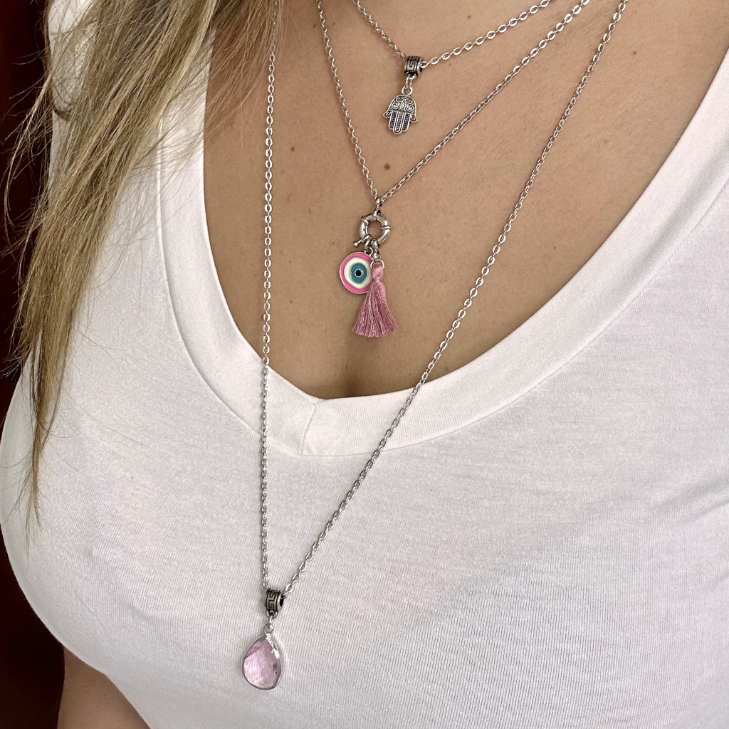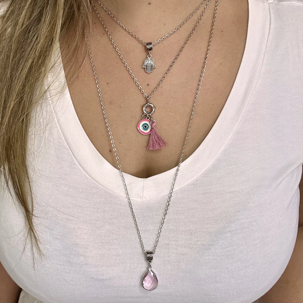 - Cor: Metais e abs banhados em prata. Pingente olho grego com detalhes coloridos e tasse na cor rosa