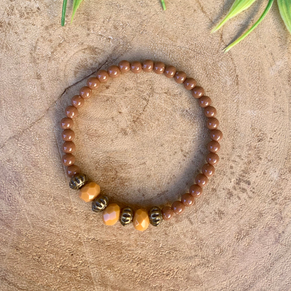 - Cor: Contas de resina marrom médio, contas de cristais terracota e metais banhados em ouro velho