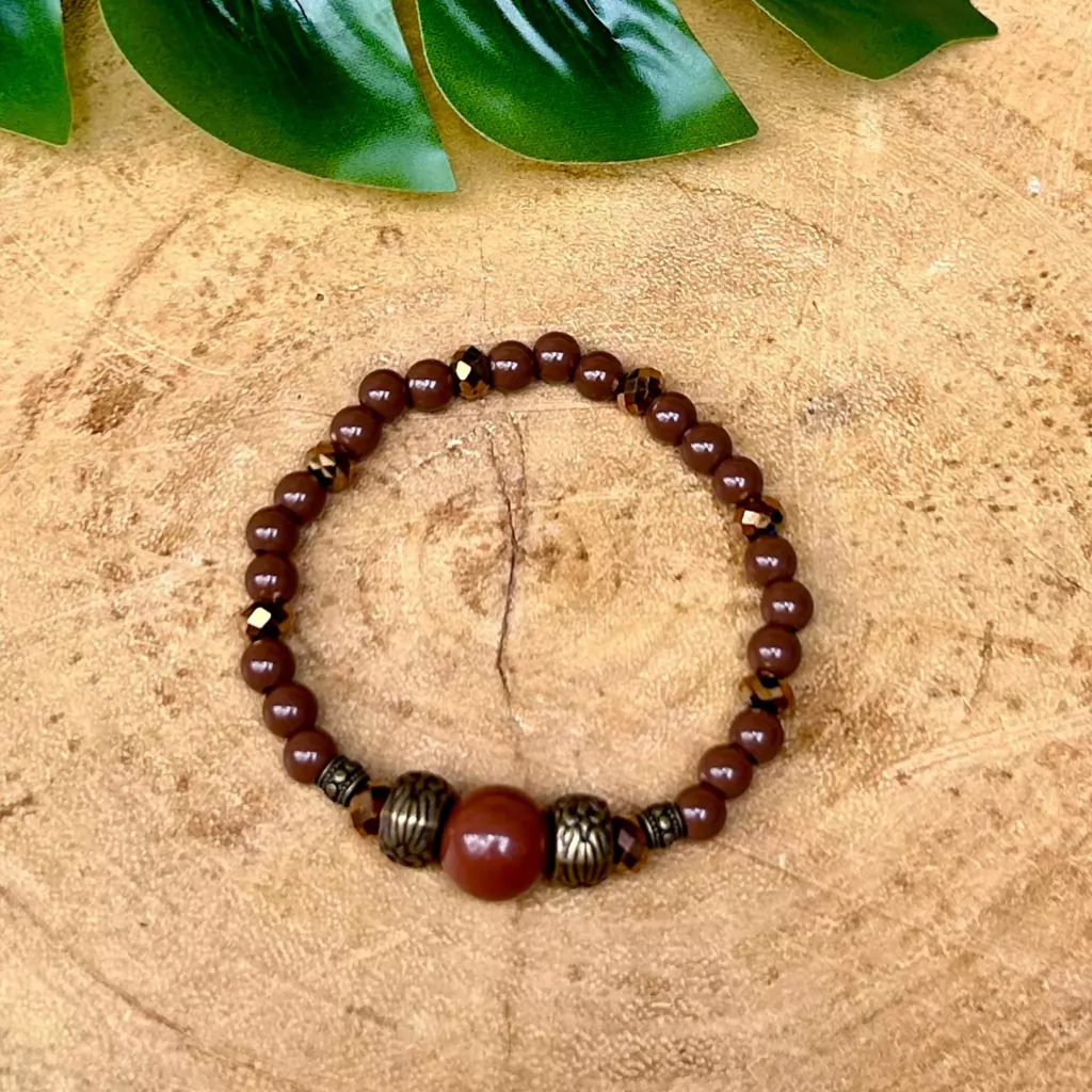 - Cor: Metais banhados em ouro velho. Contas de cristais bronze e contas de resina marrom escuro