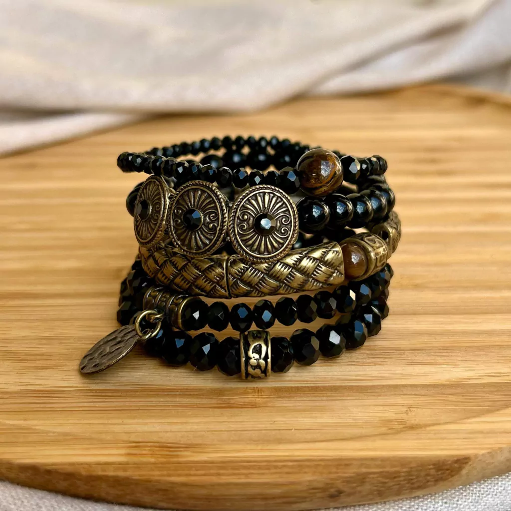 - Cor: Metais banhados em ouro velho. Contas de resina e strass na cor preta